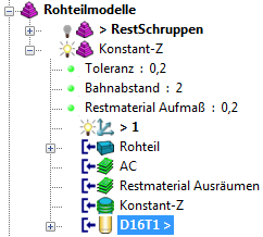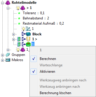 Wenn Sie die Berechnung jedes Status löschen (dies ist möglich, indem Sie einfach die Berechnung des Blocks entfernen), können Sie die Rohteilmodell-Parameter (z. B. Toleranz, Bahnabstand oder Arbeitsebene) ändern. Dadurch können Sie ein Rohteilmodell bei verschiedenen Toleranzen erstellen, ohne die Werkzeugwege erneut anwenden zu müssen.