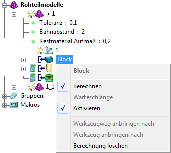 Klicken Sie mit der rechten Maustaste im Explorer auf einen Rohteilmodell-Block, um das Menü anzuzeigen.
