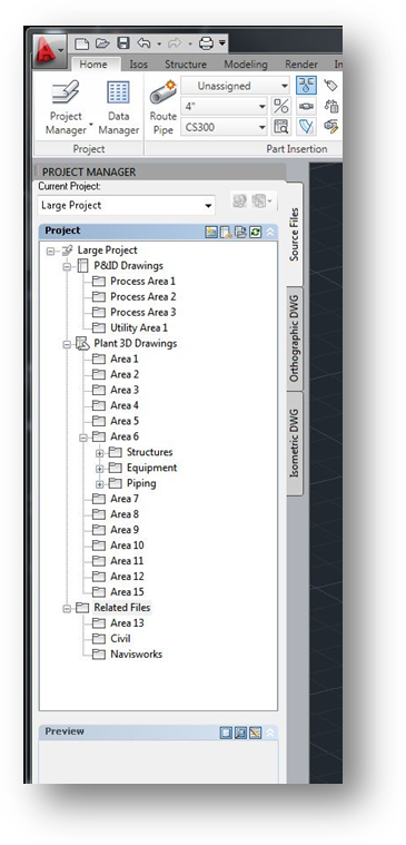 Im Fall von P&IDs haben wir das Projekt in drei verfahrenstechnische Bereiche plus einen Versorgungsbereich unterteilt, der alle Versorgungs-P&IDs (bzw. ULDs) enthält. Die Tatsache, dass sich der P&ID-Bereich über mehrere Rohrleitungsbereiche erstreckt, ist unerheblich, da Plant 3D alle Leitungen und Apparate im Projekt verfolgt und verwaltet.