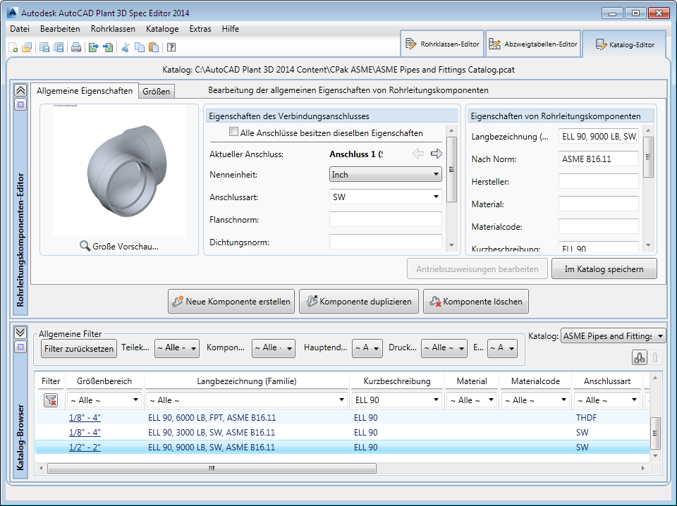 Ermöglicht das Bearbeiten von Kataloginhalten, um Teilinformationen anzupassen. Sie können Teile aus einem Katalog hinzufügen und entfernen. Sie können Teileigenschaften ändern, einschließlich Teilbemaßungen zur Verwendung in AutoCAD Plant 3D toolset-Modellierungen.