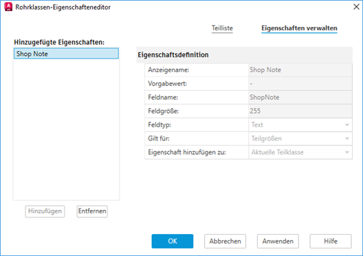 Ermöglicht das Hinzufügen neuer Eigenschaften und das Festlegen von Eigenschaftsdefinitionen für die aktuelle Auswahl oder für alle Teile in einer Rohrklasse.