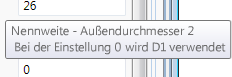 Halten Sie die Maus über ein Größenfeld, um wichtige Informationen zu dem Parameterwert anzuzeigen. Einige Parameter ermöglichen die Eingabe von speziellen Werten wie Null, um einen Vorgabewert festzulegen oder eine Markierung für die Zeichnung einer Manschette anzubringen.