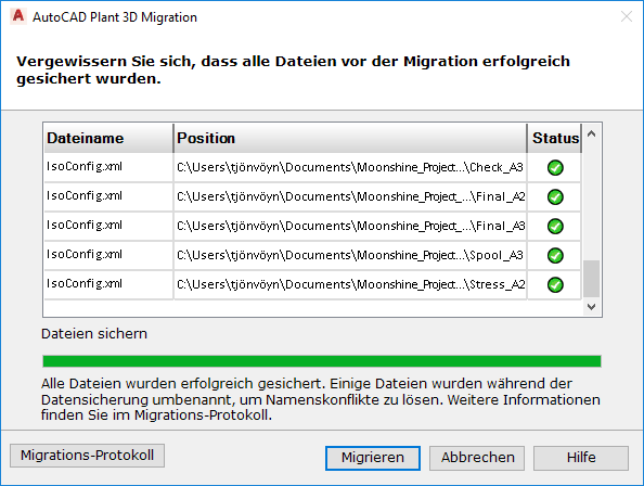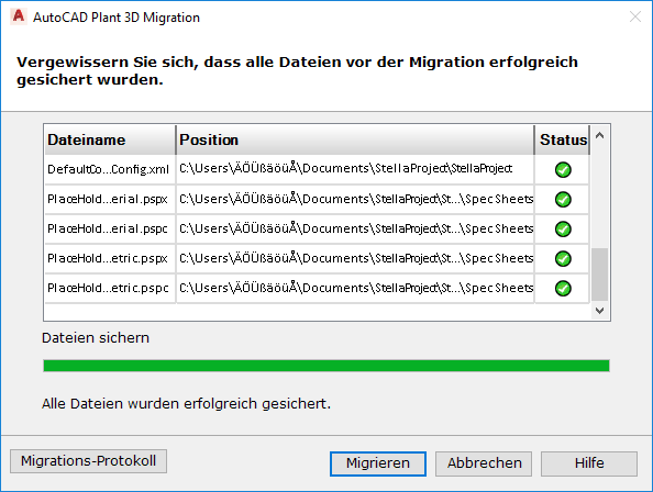 Wenn Sie ein in einer früheren Version erstelltes Projekt öffnen, wird der Assistent für die Projektmigration gestartet. Dort wird das Dialogfeld zum Starten der Projektmigration angezeigt. Während des Migrationsprozesses können Sie eine Sicherungskopie des Projekts und der verbundenen Zeichnungen erstellen. Mit einer Sicherungskopie wird gewährleistet, dass das Projekt auch weiterhin in der früheren Version geöffnet werden kann. Wenn Sie den Migrationsprozess abbrechen, werden das Projekt und die verknüpften Dateien in den ursprünglichen Zustand zurückversetzt.