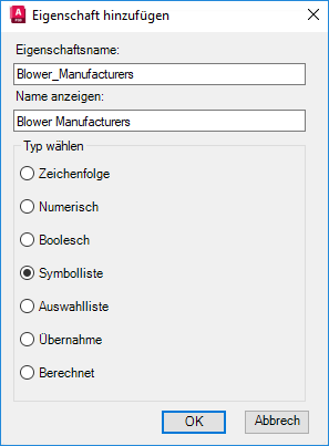 - Geben Sie einen Eigenschaftsnamen für die Komponente oder Linie an (z. B. Gebläse_Hersteller).
