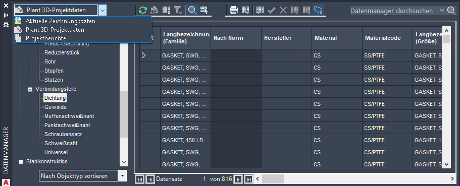 Im Datenmanager stehen verschiedene Möglichkeiten zum Anzeigen Ihrer Daten zur Verfügung: nach Projekt, nach Zeichnung oder nach integrierten Berichten.