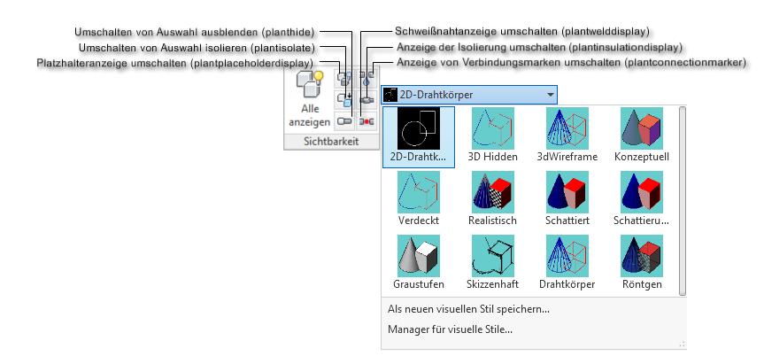Sie können den Anzeigestil ändern, um Ihr Modell je nach Leistungsanforderungen mehr oder weniger realistisch anzuzeigen. Außerdem können Sie einzelne Plant 3D-Objekte anzeigen oder ausblenden.