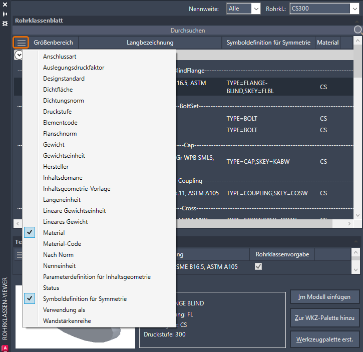 Der Rohrklassen-Viewer ermöglicht das Anpassen von Spalten und das Durchsuchen nicht angezeigter Eigenschaften.