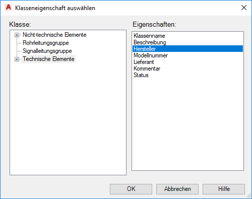 Zeigt eine Liste der Eigenschaften basierend auf der ausgewählten Klasse an.