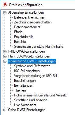 Die für die Konfiguration verfügbaren ISO-Einstellungen umfassen Stile, Bemaßungen, Leitungen mit Gefälle, Beschriftungen und das Schriftfeld.