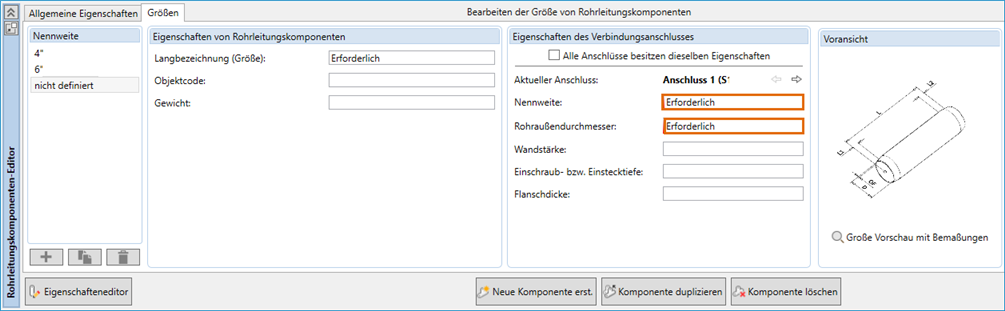 Legen Sie die Verbindungsanschlusseigenschaften der Komponente fest. Legen Sie die größenabhängigen Eigenschaften fest, beispielsweise die Langbezeichnung und das Gewicht.