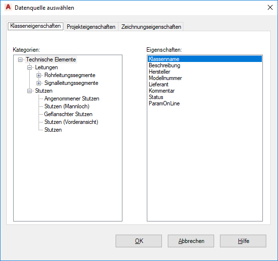 Das Dialogfeld Datenquelle auswählen enthält drei Registerkarten, mit denen Sie eine Eigenschaft als Quelle für den übernommenen Eigenschaftswert auswählen können. Sie können eine Klassen-, Projekt- oder Zeichnungseigenschaft auswählen.