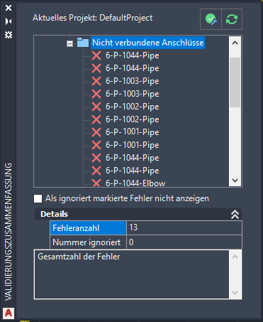 - Um Informationen zu den einzelnen Fehlern anzuzeigen, klicken Sie in der Struktur der Validierungszusammenfassung auf einen Fehlerknoten. Die Zeichnung wird auf das fehlerhafte Objekt gezoomt.