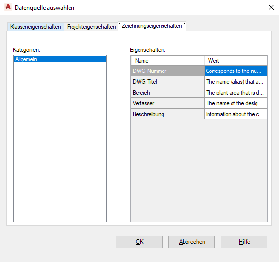 Zeigt eine Liste der Zeichnungseigenschaften an, die als Datenquelle ausgewählt werden können.