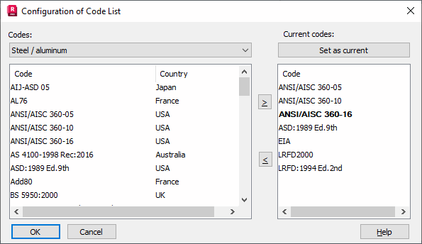 Use this dialog to set up the list of available codes for design codes and loads.