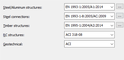- RC - Click the arrow at the end of this field to select the codes required for RC structure element design. After calculating reinforcement for these structure elements, you obtain the provided reinforcement area and distribution of reinforcement in an RC structure element.