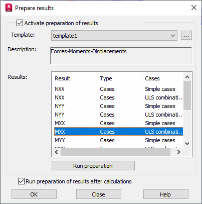 To calculate results, click Run preparation or activate the Run preparation of results after calculations option. When calculations of a structure model complete, result preparations will start automatically.