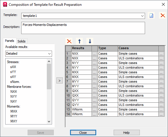 - The Type column determines which result types (forces, moments, stresses, displacements, and others) to prepare.