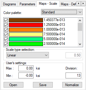 You can save the color palette to a file, open it from a file, or normalize it. Normalization of the scale adjusts the scale of a selected quantity by adopting the minimum and the maximum values of the selected quantity as the range limits.