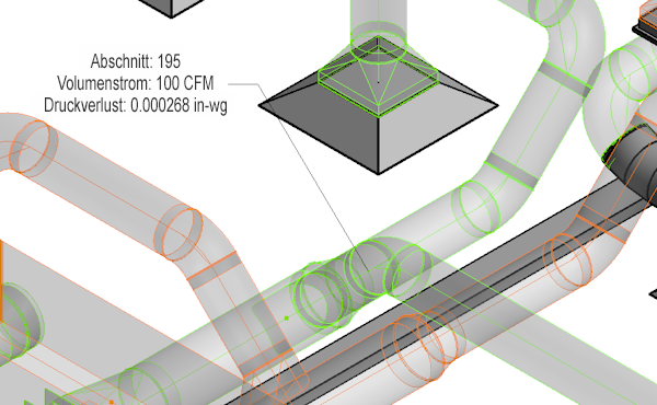 Prüfen und visualisieren Sie Druckverlust- und Volumenstromdaten in Entwurfs- und Fertigungsnetzen. Analytische Segmente werden in der Benutzeroberfläche als Teilelemente angezeigt. Diese Segmente können ausgewählt, beschriftet und in Bauteillisten aufgenommen werden.