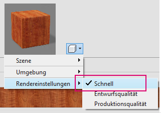 Wenn Sie im Material-Browser auf der Registerkarte Darstellung arbeiten, verwenden Sie das Dropdown-Menü neben der Miniaturansicht des Materials, um die Rendereinstellungen für die Miniaturansicht zu konfigurieren. Die neu hinzugefügte Rendering-Einstellung Schnell beschleunigt die Erstellung der Miniaturansicht, wenn Sie die Materialauswahl ändern.