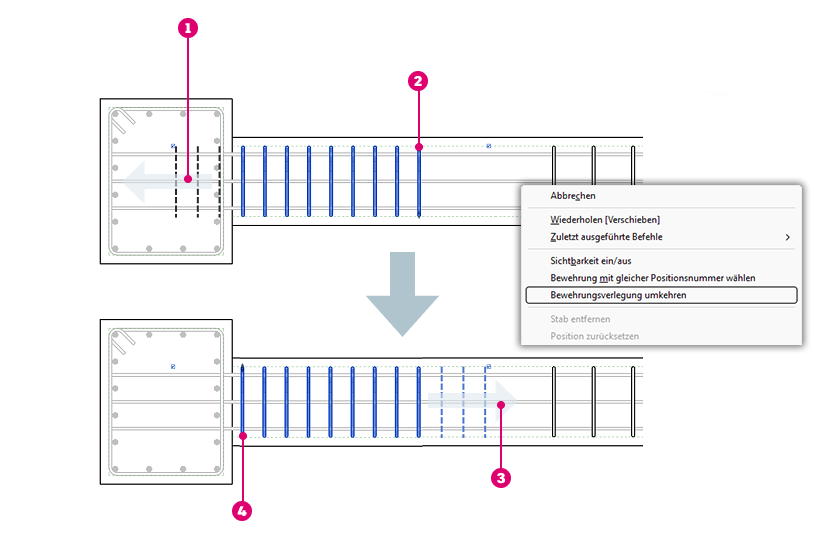Um die Richtung zu wählen, in die eine Bewehrungsverlegung erweitert wird, verwenden Sie die Option Umkehren im Kontextmenü.