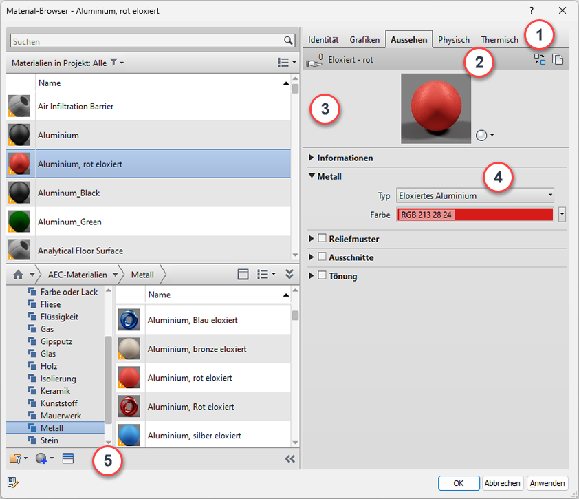| 4 | Eigenschaftenbereich: Hier können Sie detaillierte Eigenschaften des ausgewählten Objekts anzeigen und verwalten. Der Name und die Beschreibung des Objekts werden unterhalb des Bereichs Informationen angezeigt. Im Beispiel oben werden die Eigenschaften unter Metall für das Darstellungsobjekt Eloxiert - Rot angezeigt (d. h., dieser Abschnitt ist erweitert). Der Satz der für eine Flüssigkeit angezeigten Eigenschaften unterscheidet sich beispielsweise vom Satz der für Metall angezeigten Eigenschaften. |