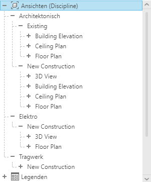 So können Sie beispielsweise Ansichten nach Disziplin, Phase und Ansichtstyp ordnen. Darüber hinaus können auch Pläne und Bauteillisten/Mengen im Projektbrowser geordnet werden.