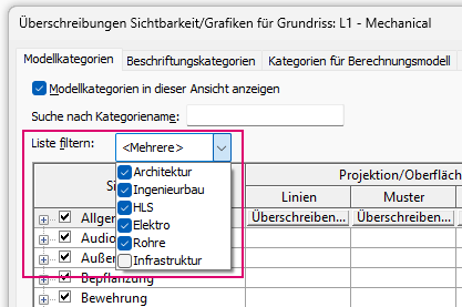 Die Filter für Disziplinen im Dialogfeld Überschreibungen Sichtbarkeit/Grafiken wurden entsprechend dem Kundenfeedback aktualisiert.