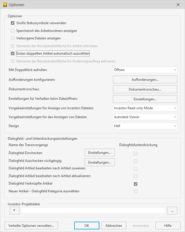 Vorgabeeinstellungen für Anzeige von Inventor-Dateien