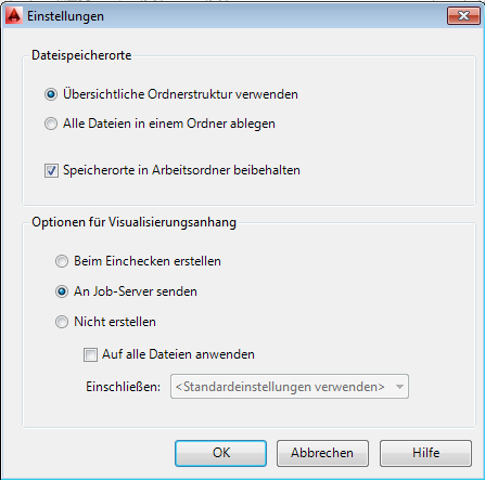 Klicken Sie im Dialogfeld Einchecken auf die Schaltfläche Einstellungen, und wählen Sie im Abschnitt Optionen für Visualisierungsanhang die Option An Job-Server senden aus.