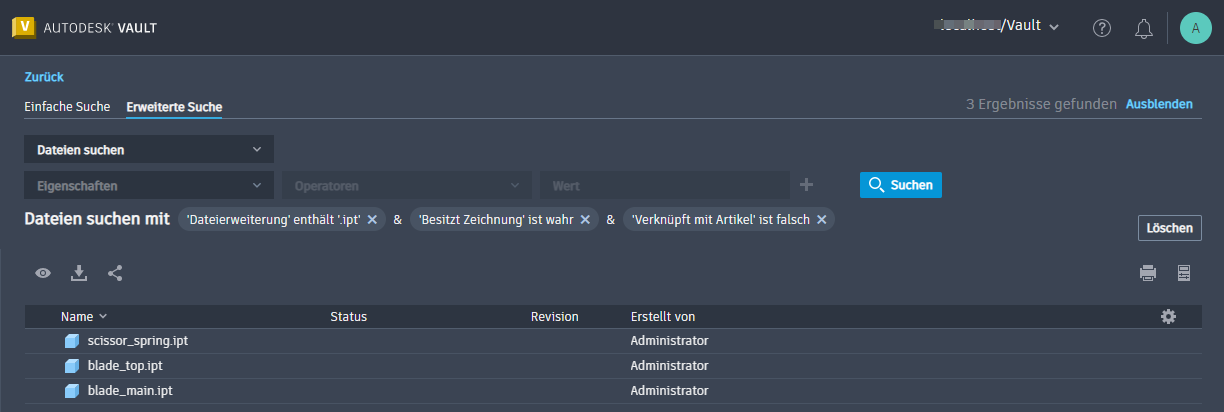 Sie können Objekte mithilfe der erweiterten Suchkriterien an beliebigen Stellen in einem Tresor oder in verschiedenen Arbeitsbereichen suchen. Vorgabemäßig wird eine erweiterte Suche in dem Arbeitsbereich initiiert, aus dem sie gestartet wird. Wenn Sie sich beispielsweise im Arbeitsbereich Artikel befinden und die erweiterte Suche durchführen, gibt die Suche nur Ergebnisse aus dem Arbeitsbereich Artikel zurück.