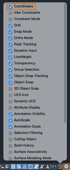 If coordinates are not displayed on the status bar, select Coordinates from the status bar settings.
