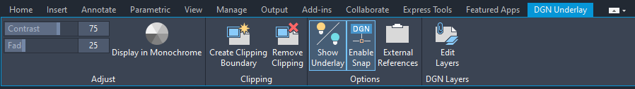 When you select a DGN underlay in a drawing, the DGN Underlay Contextual tab is displayed on the ribbon.