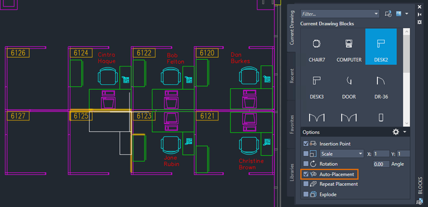 The block placement engine learns from your existing block instances in the drawing to infer the next placement of the same block. As you insert a block from the Blocks palette, the engine provides placement suggestions close to similar geometry where you've previously placed that block.