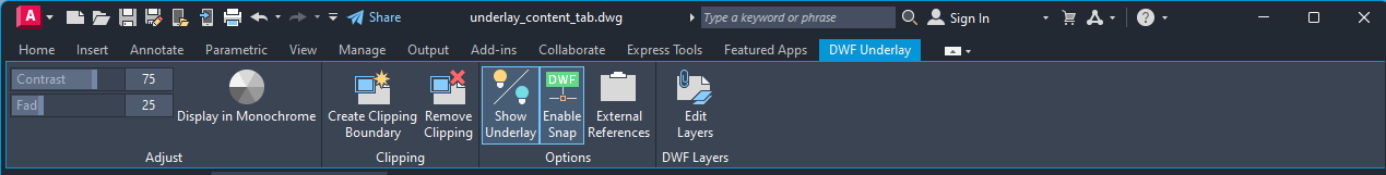 When you select a DWF underlay in a drawing, the DWF Underlay Contextual tab is displayed on the ribbon.