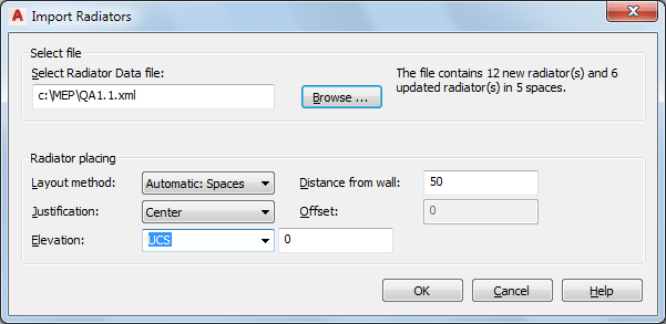 You can add radiators to a drawing using data from an XML file produced by a heating calculation program such as SOLAR COMPUTER Desktop. The XML file contains an identifier for one or more of the spaces in the model. Each space identifier in the file precedes a list of the radiators to be placed into the space.