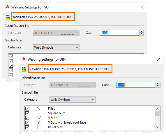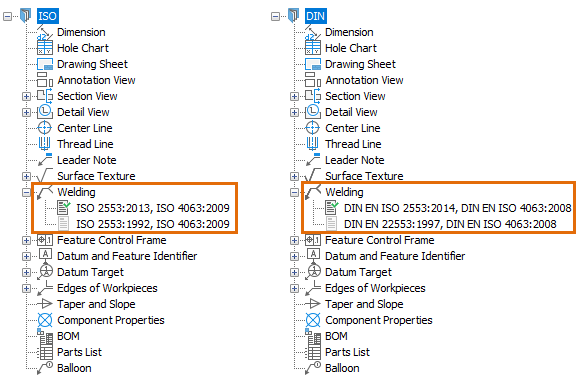 With the added support to the new ISO and DIN standard revisions, you can annotate documents created in AutoCAD Mechanical toolset using the latest revisions of the welding standards. Although, you can use the latest revisions in new documents, AutoCAD Mechanical toolset will continue to support the legacy revisions to allow documents created in previous releases to be opened, edited, and saved.