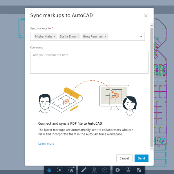 In Autodesk Docs, add markups to a PDF file, then share the PDF from Autodesk Docs with collaborators who can view the markups in the AutoCAD Trace environment. The PDF is continually connected to the AutoCAD drawing, meaning as updates and revisions are made to the PDF markup file in Autodesk Docs, collaborators can see those changes in AutoCAD.