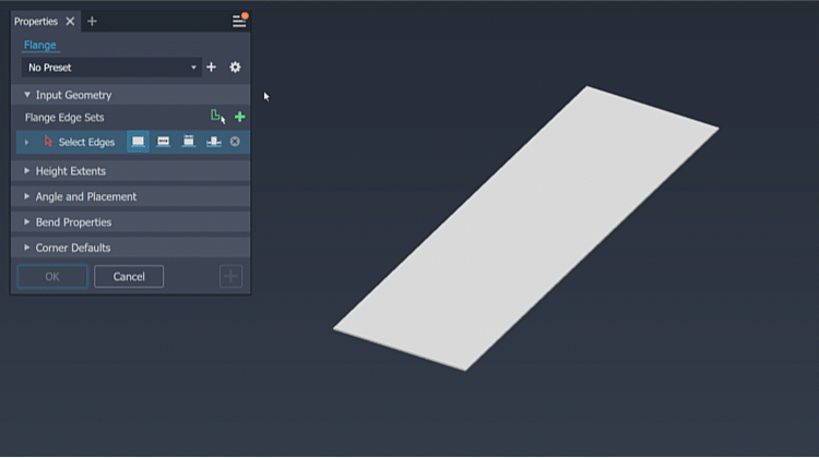 You can add a sheet metal face and bend connected to an existing sheet metal face with a specified angle. When you create the flange, the flange previews along the edge you select using default parameters, the last used values, or a preset.
