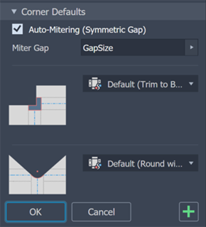 In the Corner Defaults group, you set the Auto-mitering option, the Corner Shape, and Corner Relief. Select corner options from the corresponding list.