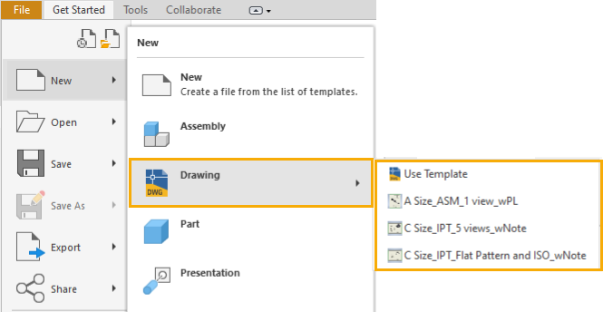 From File New Drawing: Hover over the flyout arrow to display available sheet format templates from the flyout menu, and click to make a selection. | |