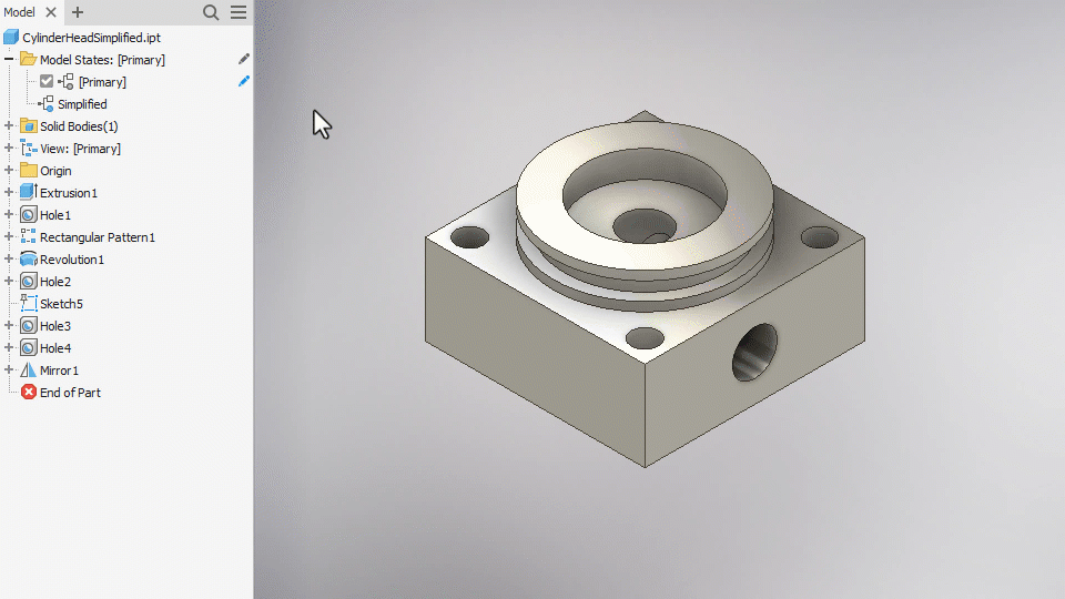 The first entry in both Part and Assembly Model States is named Primary. Primary can be modified as desired like other model states. Primary cannot be renamed, reordered, or deleted.