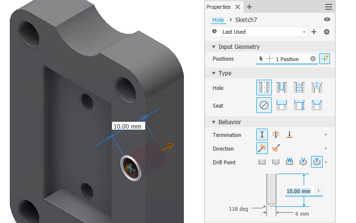 Quickly place holes using presets, or specify the hole dimensions, drill point, termination, and thread type options using the property panel.
