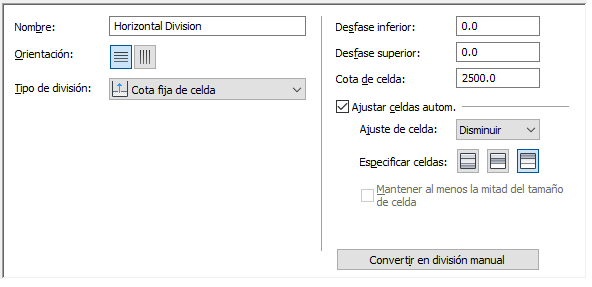 Si va a definir una división vertical, la cota de celda corresponderá a la longitud de la celda de un montante a otro. Si va a definir una división horizontal, la cota de celda corresponderá a la altura de la celda.