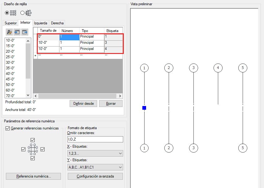 De este modo, el primer hueco se extiende dos huecos hacia la parte inferior, obteniendo cuatro líneas de rejilla, en lugar de cinco. Ahora puede pasar a la ficha Izquierda para editar el otro eje de la rejilla o bien pulsar Intro para colocar la rejilla en el dibujo.