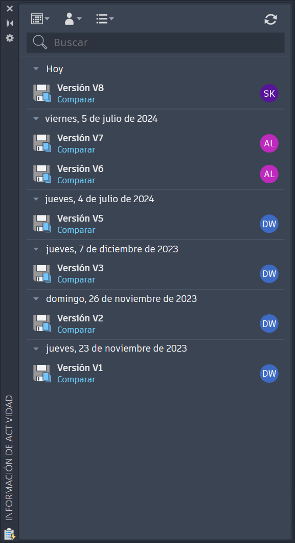 Una vez que la paleta Información de actividad esté abierta, puede filtrar las actividades que se encuentren dentro de ella por fecha, usuario, actividad o nombre de archivo.