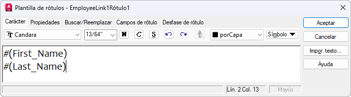 Aplica un estilo de texto al rótulo. El estilo actual se guarda en la variable de sistema TEXTSTYLE. El formato de carácter para el tipo de letra, la altura y los atributos negrita y cursiva se ignora si se aplica un estilo nuevo a una plantilla de rótulo ya existente. Los atributos de apilación, subrayado y color se mantienen en los caracteres en los que se aplica un nuevo estilo. No se aplican estilos con efectos cabeza abajo o hacia la izquierda. Si se aplica un estilo definido con un efecto vertical a un tipo de letra SHX, el texto se muestra en sentido horizontal en el cuadro de diálogo Plantilla de rótulos.