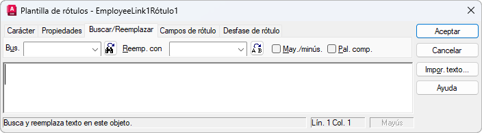 Busca cadenas de texto especificadas en la plantilla de rótulo y las reemplaza con texto nuevo.