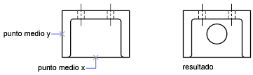 El agujero de la placa de fijación que se muestra en la siguiente figura se ha centrado en el rectángulo a partir de las coordenadas X,Y de los puntos centrales de los segmentos de línea horizontales y verticales de la placa.