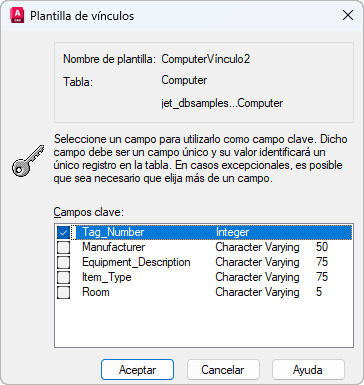 Muestra todos los campos disponibles para la tabla de base de datos actual, así como el tipo de campo y, si se trata de campos de caracteres, la longitud. Puede especificar los campos clave de la plantilla de vínculos activando la casilla de verificación situada a la izquierda del nombre del campo.